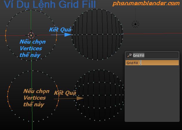 Lệnh Grid Fill giống như điền vào chỗ trống vậy, bạn có một edge loop rỗng (xem hình dưới), hình thứ nhất bạn chọn mỗi bên 3 vertices, sau khi sử dụng lệnh Grid Fill thì nó sẽ ra hình kế tiếp bên phải. Grid Fill không đơn thuần là nối 2 edge loop trong một Edge Loop rỗng lại, mà nó còn tạo luôn Loop Cut dựa vào số lượng Vertices chúng ta chọn làm Edge Loop lúc ban đầu.